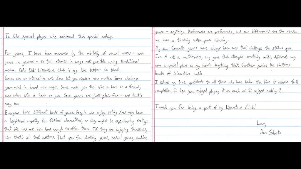 The final “true” ending of the game was quite heartwarming too. It came with a scene containing a letter from Dan Salvato himself. He thanked the players that stuck through until the very end and have spent the time with the characters he had created. And most important of all, everything he said about storytelling in games are very true.
